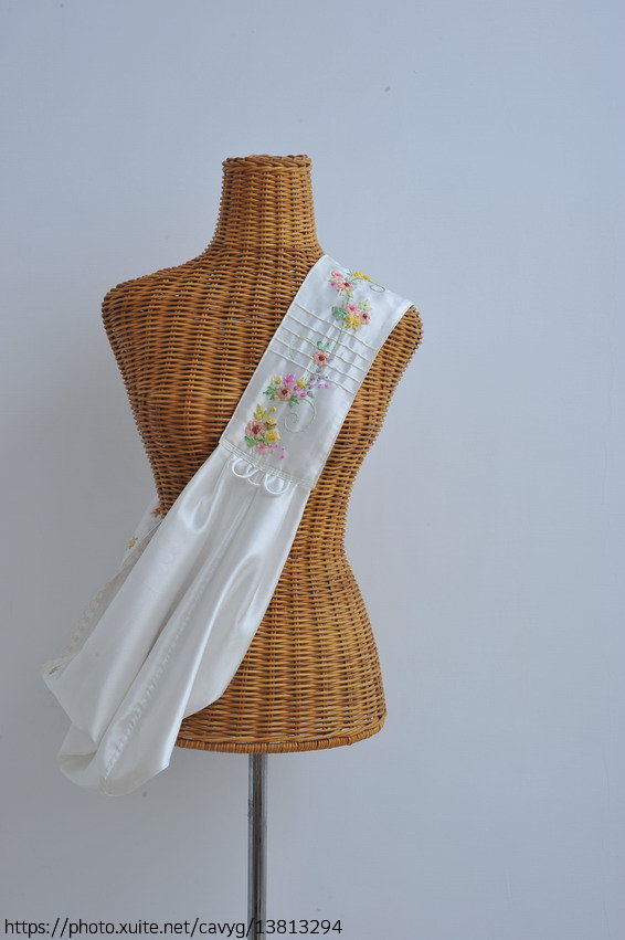 肩部的地方加上厚布襯可以加強承重,花案及布料不同的選擇可呈現出使用者想要的風格,花案跨肩從正面延伸到背面,素雅的配置是重點。