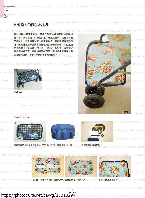 最主要的方法就是把布邊拆掉,重取一片表布,依拆下來的舊表布當做版型描繪,很快就能完成,其實最麻煩最耗工時的只是拆布邊,因此我都是把各個部位先拆開分成幾包,也以免重組之後弄混了,然後一包一包地利用寶寶休息或睡覺的零碎時間拆線,一旦拆好,裁布只要依樣描繪剪下,完成的速度飛快,而且看似十分複雜的組合,其實也沒有想像中的那麼多片。