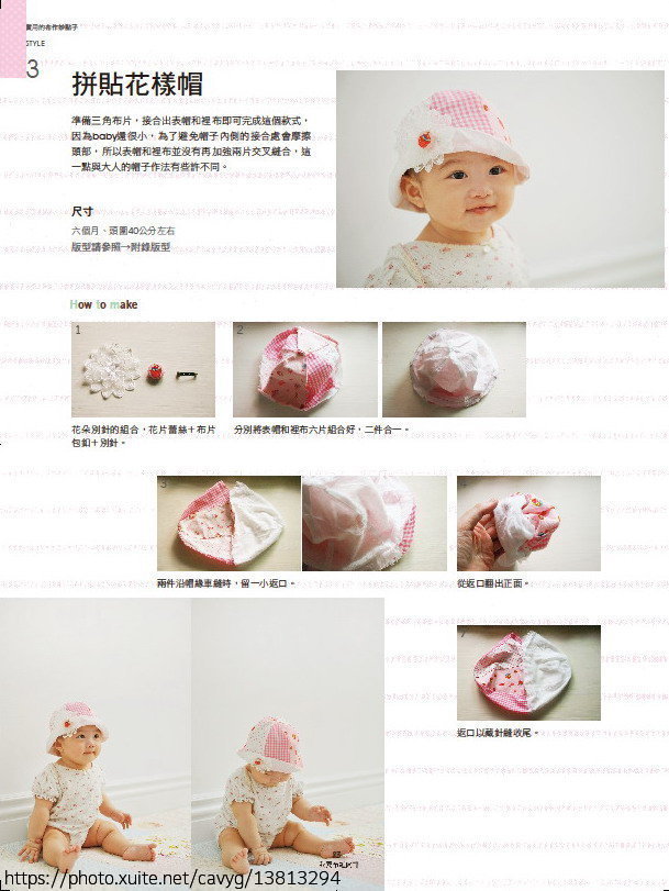 可愛又簡單的蓬蓮帽,只需要二片組合,任何手工新手都能辦到,頭圍部分利用蕾絲穿上緞帶就能依嬰兒的頭圍調整,載的時候把它整理得蓬蓬的,baby的可愛度會直線上昇。如果家中baby怕熱,布料可選擇有洞的,這塊 零碼 小布是過去做裙子所剩下來的,因此家中只要有一小塊布料,就能動手試看看了!