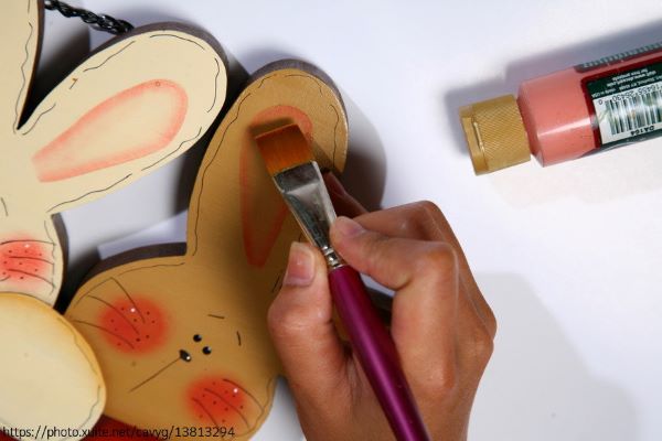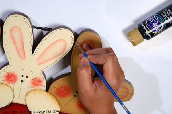 依設計圖案,拓印兔子表情在木板上,再線筆描繪。