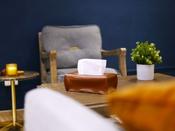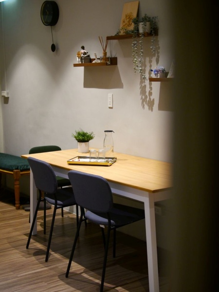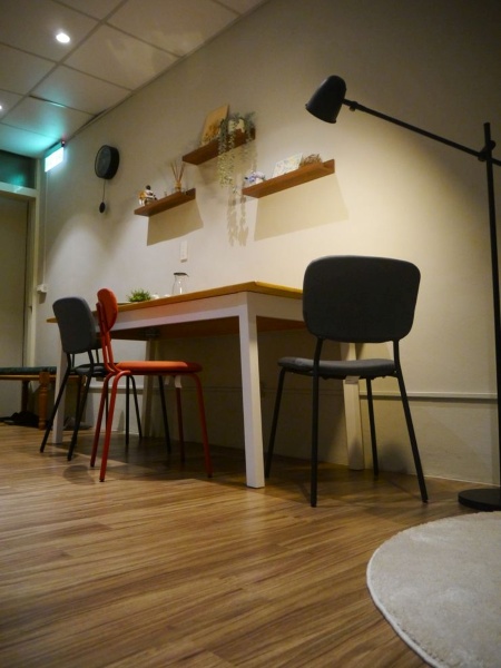 二樓是主要的談話場域,空氣氛圍寧靜,原木的桌椅厚實圓潤,放著是已經絕版的第一代重量毯款式,已經是2016年間的作品,使用時間距離現在應該有6年之久,再次見面感受著它所在之處的溫柔,落腳在美麗的諮商所內,共駐為守護。