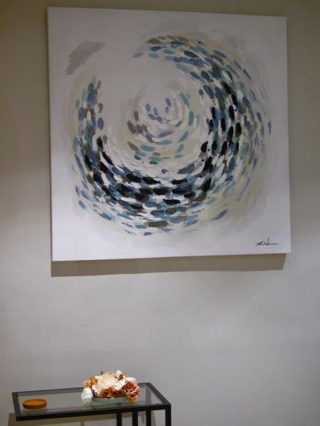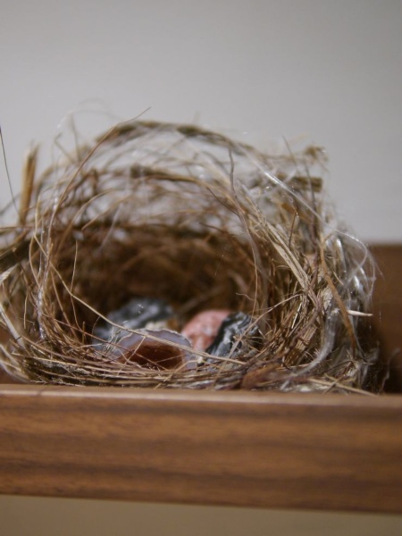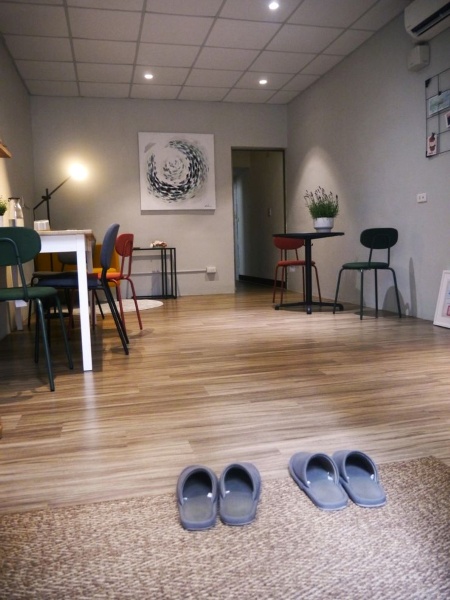 諮商所一樓是會客與陪伴親友來訪時,可安穩停留的大廳,兩側陳設桌椅,一眼到底的空間,眼底有一幅流動的主畫,隱隱閃耀。側牆上藏著一個小鳥巢,這原是在諮商所門口鳥兒築起的小家,產下蛋,成功孵出下一代的孕育搖籃,翩然飛去後,留下曾停留過的幸福痕跡,被收納在此。
