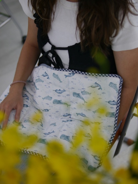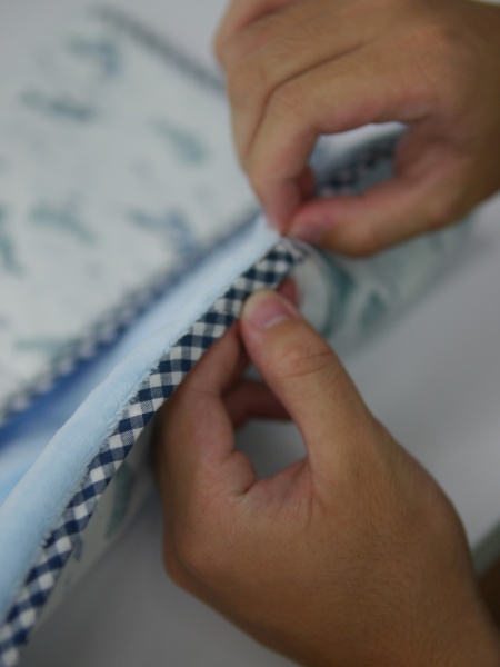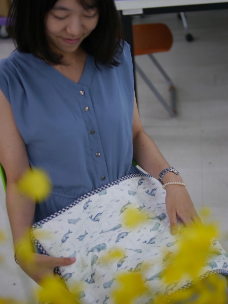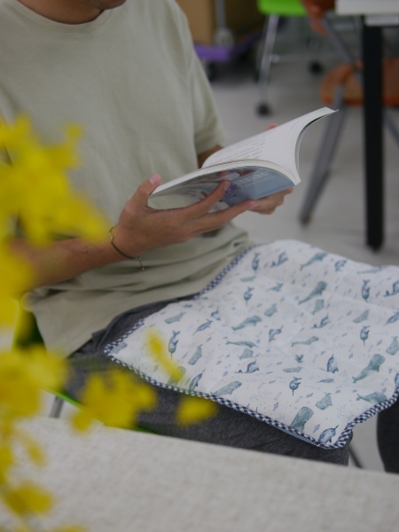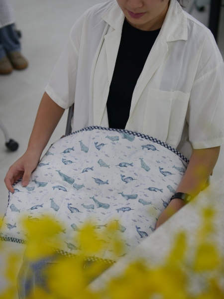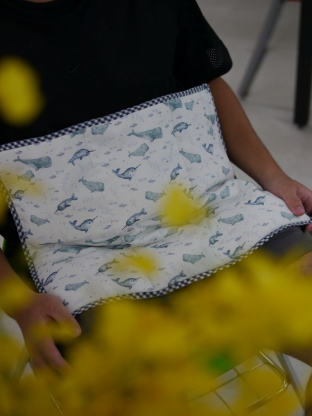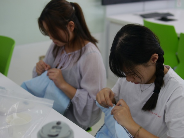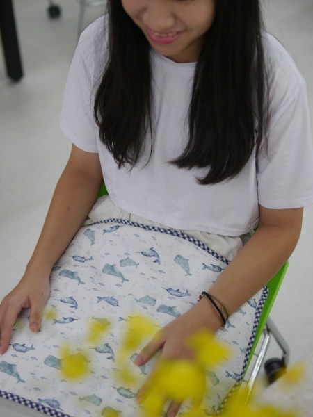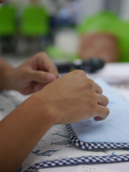 這一班學生縫製的程度令我亮眼,不只針法都對了,而且還鬆密有度,雖然絕大部分的人都是第一次學縫合,但是整體均質明顯學習能力都很強大,幾乎每一件都縫得很好,其中平時沒有動針線經驗的兩個男生,縫合成品正確又平整,用手指摸過去,重量毯被縫合的地方,是一個均衡的針趾在前進,針趾細膩好看,完成的重量毯收尾美麗,如此成功的縫合成果,應該可以拿回家跟媽媽炫耀。