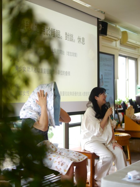 這次也開放更多人上台試蓋重量毯,讓大家都有機會體驗不同的重量。