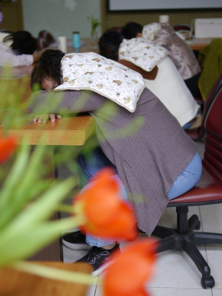 課程尾聲有一段「休息與安眠引導」,讓大家實際蓋上自己縫製的重量毯、感受它帶來的安定支持。因此也許只是靜靜的趴在桌子上讓眼睛休息5到7分鐘,剛才很努力的身體有一個地方可以停歇下來。